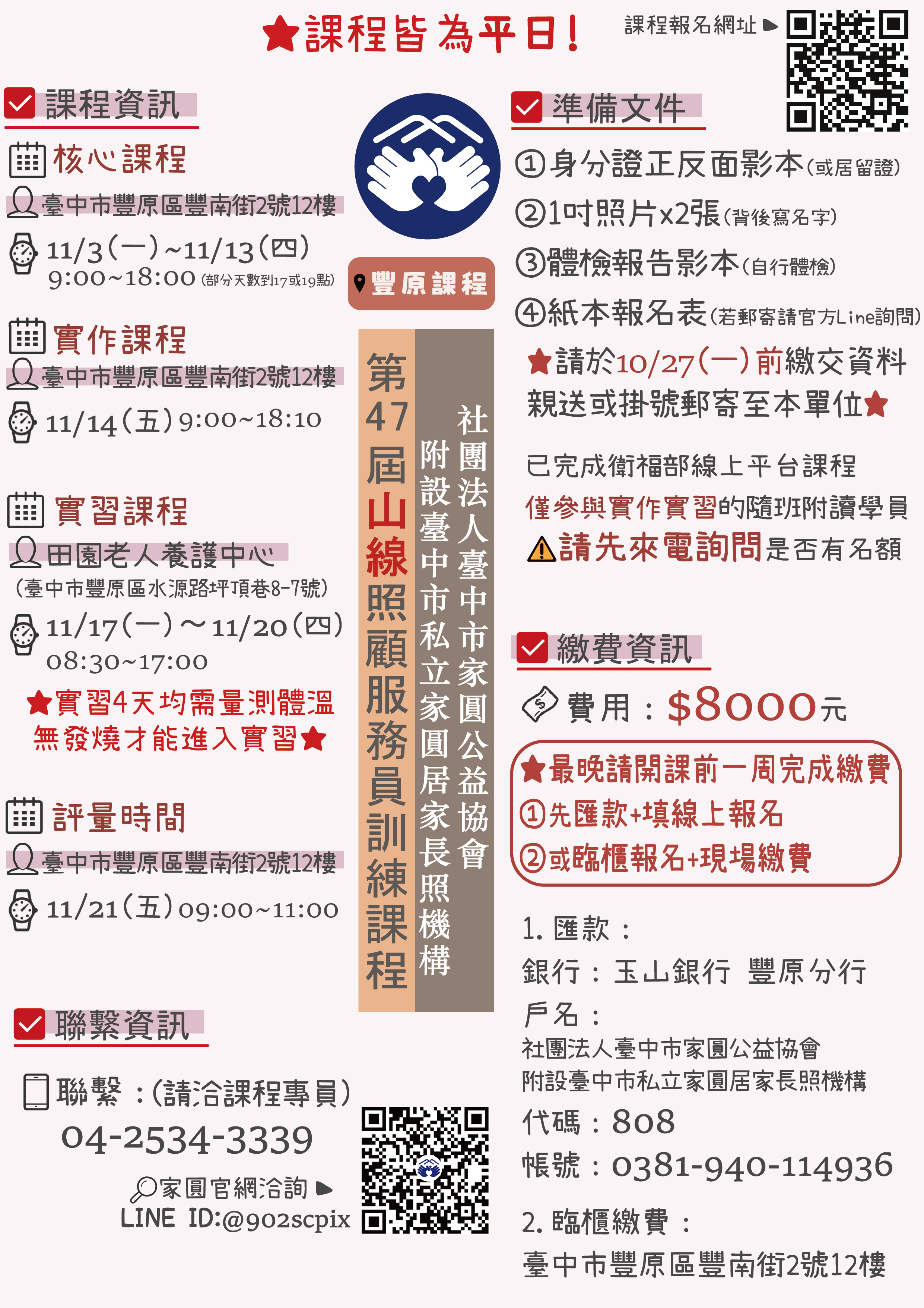 課程介紹 首頁 課程規劃 課程介紹 2025 11-03 ✨【豐原】第47屆山【照顧服務員93小時訓練課程】 【平日自費班】 【核心課程】11/3(一)~11/13(四) 【實作課程】11/4(五) 9:00-18:10 【地點】 臺中市豐原區豐南街2號12樓 【實習課程】11/17(一)~11/20(四) 8:30-17:00 【地點】田園老人養護中心 (臺中市豐原區水源路坪頂巷8-7號) 【評量時間】11/21(五) 9:00~11:00 【地點】臺中市豐原區豐南街2號12樓 ※最晚請於開課前一周完成繳費※ ★『先匯款』+『完成線上報名』 ★或『臨櫃報名』+『現場繳費』 回列表