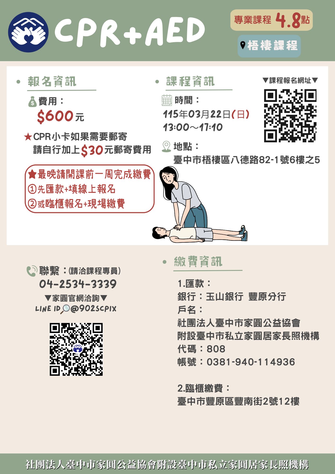 課程介紹 首頁 課程規劃 課程介紹 2026 03-22 【梧棲】CPR+AED ▲【3/22(日)】13:00-17:05 ❗【梧棲課程】 ❗【上課地點】臺中市梧棲區八德路82-1號6樓之5 ※最晚請於開課前一周完成繳費※ ★『先匯款』+『完成線上報名』 ★或『臨櫃報名』+『現場繳費』 回列表