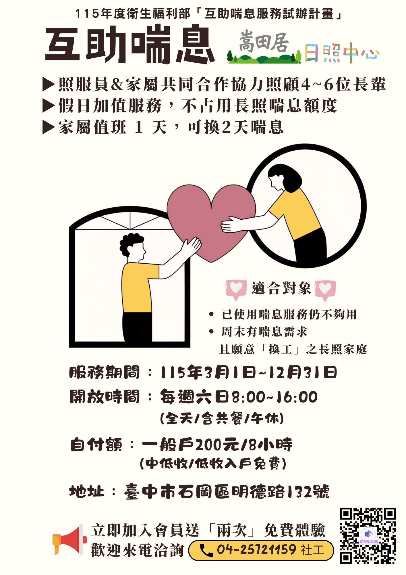 最新消息 首頁 最新消息 2026 03-01 嵩田居『互助喘息服務試辦計畫』開跑囉❗ 好消息 嵩田居起推出『互助喘息』計畫囉 家屬值班天可換天的喘息 假日加值服務 不佔用長照喘息額度 歡迎大家告訴大家唷 詢問可找04-25721159 (社工) 回列表
